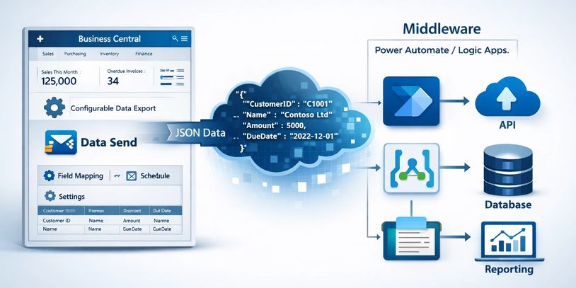 Data can be transmitted in JSON format, making it compatible with a wide range of external systems. Standard data structures can be customized through supplied publisher events, so partner-specific adjustments can be applied without modifying the core Business Central system.